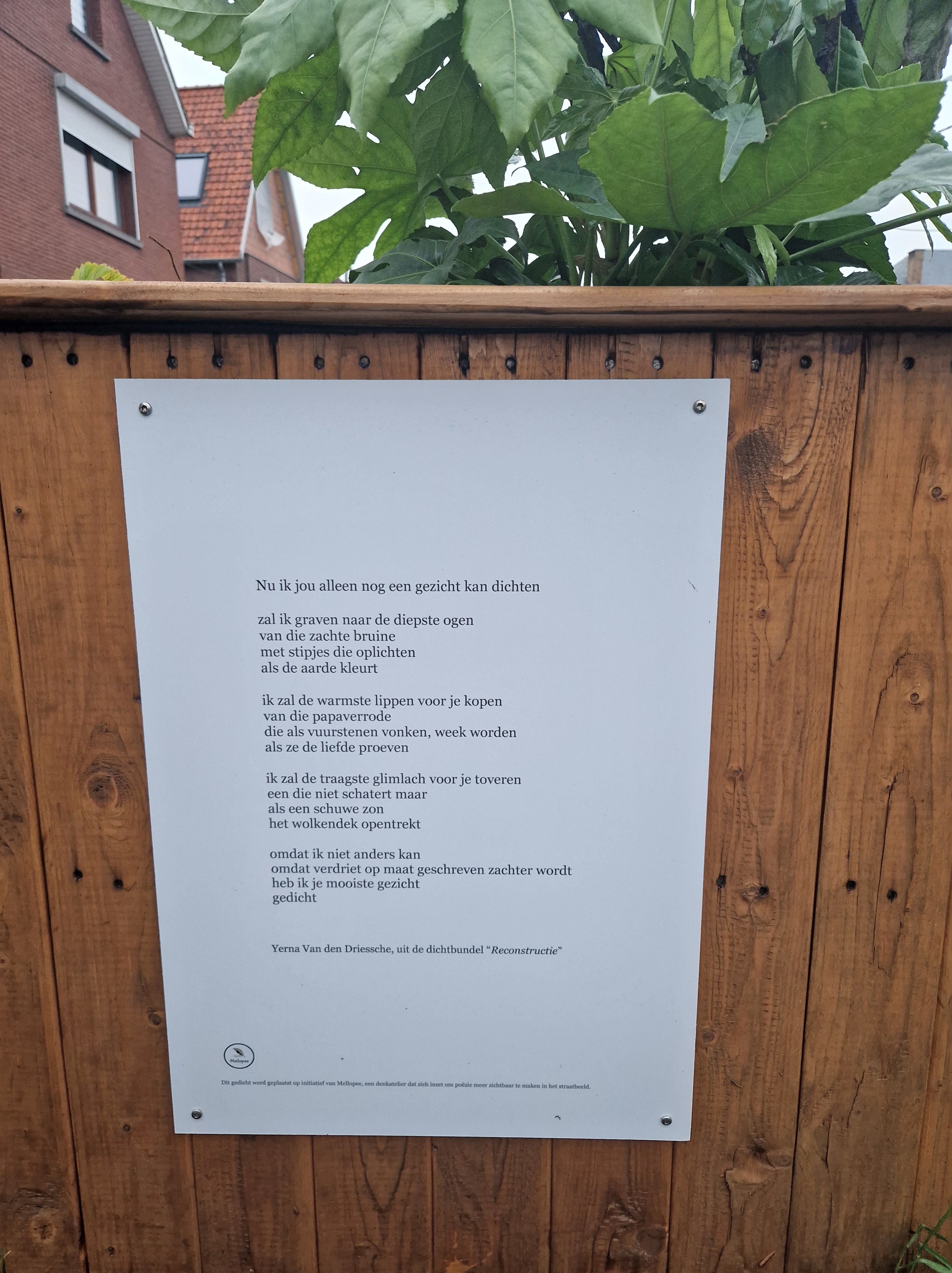 Naar aanleiding van ‘Dichter in de tuin’ kreeg mijn gedicht: ‘Nu ik jou alleen nog een gezicht kan dichten’ een plaats voor het huis van Lut en Guy in de Palmstraat 23, Melle. Initiatief van Mellopee.